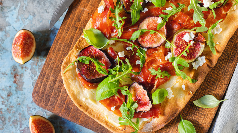 Though the terms have become somewhat synonymous with one another in recent years, and in many restaurants, flatbreads are actually made with pizza dough. There are a few other qualities that set flatbreads apart from pizzas. The shape of the dough — usually a rectangle or oval — distinguishes them from the familiar perfect circle of a pizza pie. They're often thought of as a side or appetizer, which means that the chef can experiment with more unusual toppings, especially as they don't have the time-honored expectations attached to certain flavors of pizza.