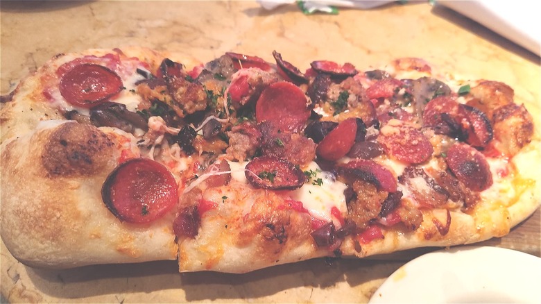 Capping off the top three restaurant chain flatbreads is a regional favorite: &pizza. The East Coast franchise currently deals in made-to-order pies at 36 locations, and its edgy theme definitely makes the process fun. Whether you're a carnivore, a vegan, or spice-lover, this is a flatbread option to look out for. The oblong crusts are coated in semolina, which adds texture and helps the pie from burning in the oven. The toppings are elevated and fresh. And the kicker? They're baked and ready-to-eat in the blink of an eye.