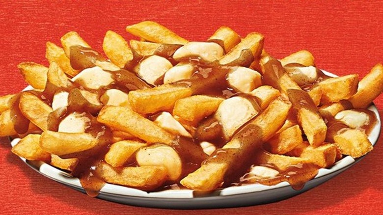 Arby's arrived in Canada over 40 years ago, and the chain has clearly taken to the culture. There are not only multiple varieties of poutine with different toppings, but Arby's Canada offers two different kinds of French fries as well. Choose between crispy crinkle-cut fries lightly sprinkled with kosher salt and Arby's signature battered and seasoned curly fries. All poutines are drenched in beef gravy and include cheese curds. It might be the batter that helps the fairly thinly cut curly fries remain so crisp, and the seasoning adds that extra bit of flavor.