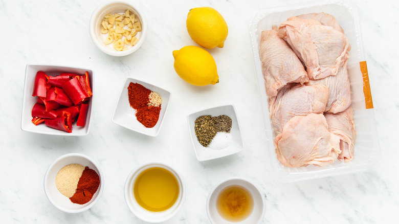 For this recipe, you'll need skin-on and bone-in chicken thighs. As for seasonings, get smoked paprika, garlic powder, oregano, salt, black pepper, red chilies (roughly chopped), garlic cloves (roughly chopped), paprika, and onion powder. Next, make sure you have olive oil, lemons (juiced), and apple cider vinegar on hand. About the chilies, Brookes suggests adjusting the spice level to your desire and notes, "I used serrano but you can use bird's eye chilies if you want to go hotter!"