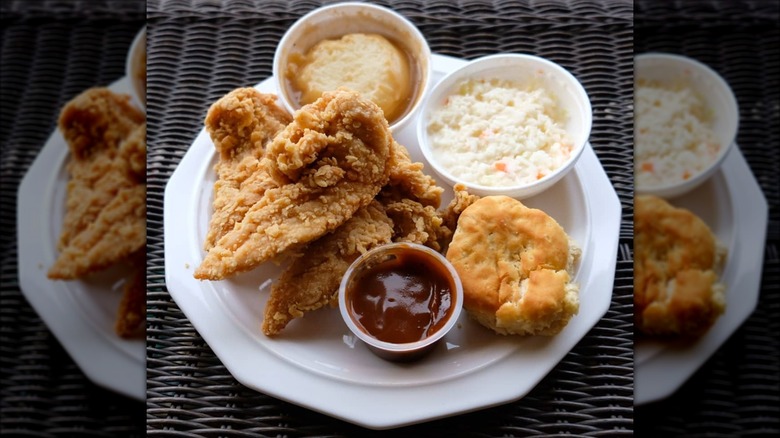 Like its competitors at KFC, Lee's Famous Recipe Chicken is pressure fried to ensure it stays moist and juicy inside even after it's been fried to a crisp. But before it's cooked, the fresh and never-frozen chicken gets dipped in honey, and is then handbred in a proprietary blend of flour, herbs, and spices. The honey and custom spice blend give Lees' Famous Recipe Chicken its signature flavor. Another thing that sets Lee's apart is that some locations (the menu varies at different locations, possibly because franchises have input on what items to serve) serve livers and gizzards, which you won't find at KFC or Popeye's.