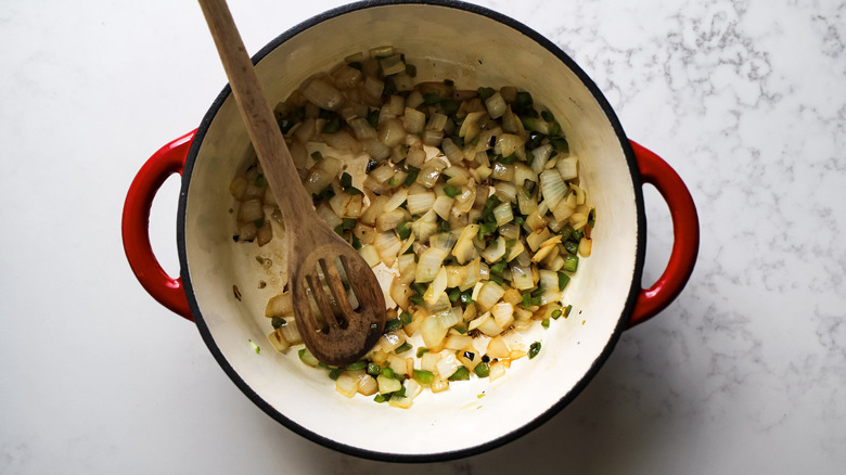 - In a large pot, add the olive oil, onion, and jalapeño. Sauté over medium heat for 3 to 4 minutes, until the onion is translucent. Add the garlic, chili powder, paprika, and cumin. Sauté for an additional minute, until the garlic and spices are fragrant.