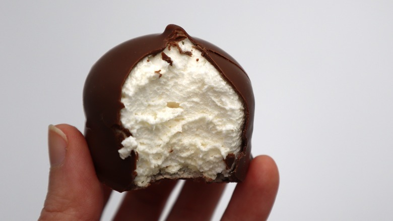 Everyone can agree that frozen marshmallow fluff tastes excellent plain. But, there are some fun recipes you can use frozen marshmallow fluff for. For example, if it's too hot out to start a fire for s'mores, why not make them frozen? Frozen s'mores require chocolate ice cream, marshmallow fluff, and graham crackers. First, take the chocolate ice cream out of the freezer and let it melt a little just so that you can spread it into a parchment-lined, 9x13 pan. Let this set in the freezer, then take it out to add a layer of marshmallow fluff evenly over the top. Pop it back into the freezer for the second time, let it set, and take the mass out of the pan to cut into graham-cracker-sized squares. With frozen, chocolate-marshmallow squares and graham crackers, you can make frozen s'more sandwiches!