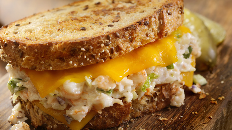 The best thing about a kimchi tuna melt is how easy it is to make. Unlike a regular tuna salad which might require chopping celery, carrots, and dill, adding kimchi all by itself will pack loads of flavor and crunchy dimension into the sandwich. Just roughly chop the kimchi and you're good to go. Then, stir up your kimchi, canned tuna, and some mayo, and toast it like a grilled cheese sandwich in a skillet with some cheese. Although this tuna melt is worthy to eat all on its own, adding some sliced avocado to the sandwich once it's off the stove will add a creamy texture and nutty flavor that perfectly balances the salty, sour bite of kimchi.