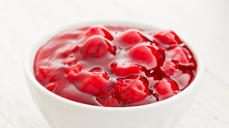 Cherries are an expensive and labor-intensive baking ingredient. If you buy them fresh, you'll spend a fair bit of money and be required to remove the pits by hand. If you buy them frozen, they can still be on the expensive side, and tend to bleed into the batter, turning it pink. Cherry pie filling offers a solution. For one thing, it's extremely affordable compared to fresh cherries. As of this writing, a 21-ounce can of cherry pie filling from Randalls costs only $3.49 compared to $4.99 for 16 ounces of fresh cherries. Considering you'll need more fresh cherries than canned due to the weight of the pits, there's an even bigger price difference.