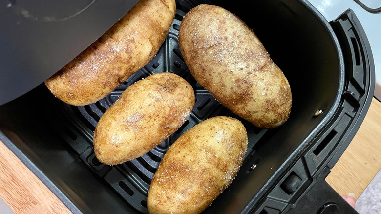 Regardless of the method used to cook your potatoes, you're still looking for the potatoes to reach an internal cooking temperature of 210 degrees. It's also not necessary to cook your potatoes in aluminum foil in the air fryer, especially if you're trying to achieve a lovely crispy potato skin from the baking process. We noticed that some air fryers have a pre-programmed "fries" setting, but that most likely won't get full-sized raw potatoes to the fully-cooked point. Instead, we preheated the air fryer to 400, then baked the potatoes, turning over once about halfway through cooking, until they registered at 210 Fahrenheit.