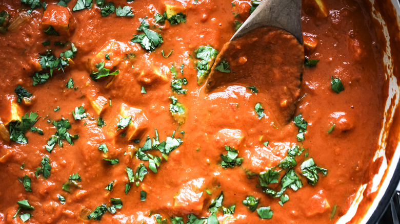To make this into a complete meal, serve it with rice and bread. Topalu notes, "Tikka masala is always served with garlic naan and basmati rice in my home but it can also be served with vegetable biryani, Jerra rice, or papadum, (a crispy Indian cracker)." A classic choice to accompany tikka masala, basmati rice provides a neutral, fluffy base that balances the spiciness of the sauce. You can cook it plain or with a touch of saffron for extra aroma. Vegan naan, which you can make or buy, works to scoop up the sauce.