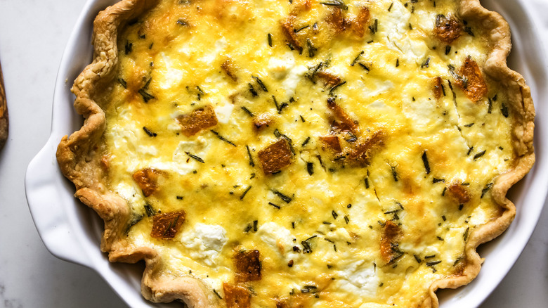 Quiche is incredibly versatile, making it easy to customize to suit your taste preferences and dietary restrictions. For starters, feel free to change up the crust. Choose whole wheat for a more nutritious twist, or use a gluten-free crust if you have sensitivities or allergies. As for the filling, Topalu says "you may swap out the goat cheese with a favorite kind of shredded cheese or use another type of squash instead of the butternut squash." We'd recommend shredded mozzarella cheese because of its ability to melt and zucchini for a pop of color.