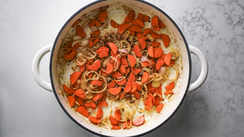 - Reduce heat to medium. Add carrot and shallots and saute for 3-4 minutes until soft.