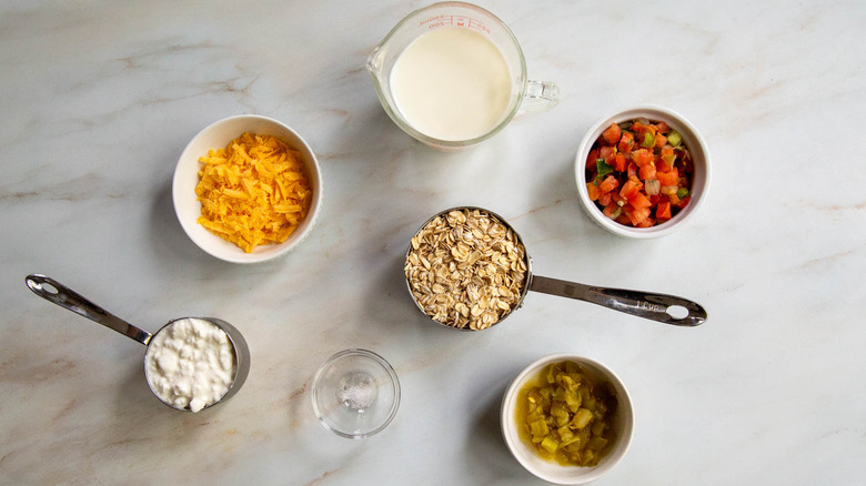 - Place the oats, milk, cottage cheese, shredded cheddar, chopped green chiles, and pinch of salt in a medium-sized bowl.