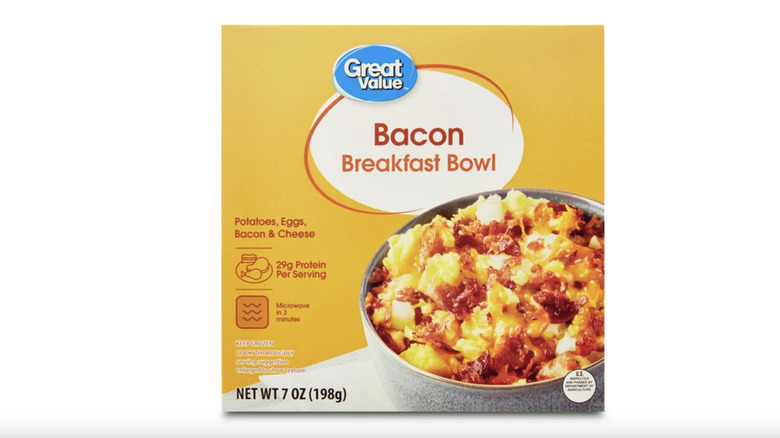 What's more, the Great Value Bacon Breakfast Bowl has received mixed reviews from customers. One reviewer called it "a great product at a great price," adding, "This is a very tasty breakfast bowl." However, another customer wasn't nearly as forgiving, saying, "Worst great value frozen meal i have ever eaten. it had maybe a tablespoon of scrambled egg in it, the bacon was fat and i couldnt even chew it. Everything was dry."