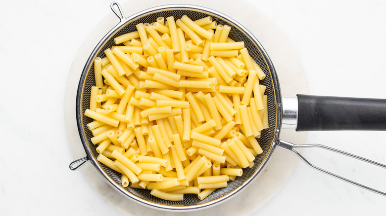 To get started on this easy recipe, you'll first need some macaroni pasta. While this boils to al dente perfection, make the creamy sauce. For this, you'll need some olive oil, diced onion, garlic powder, onion powder, Dijon mustard, all-purpose flour, soy milk, nutritional yeast, sugar, apple cider vinegar, vegan cheddar cheese, and some salt and pepper to taste. The cooked macaroni is mixed with the blended cheesy sauce and your vegan mac and cheese is ready to devour!