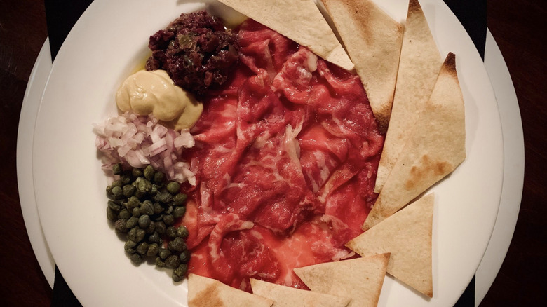 There's probably no better place to indulge in beef carpaccio than at a steakhouse. After all, steakhouse chefs have access to the finest cuts of beef, as well as a deep understanding of the meat's characteristics. Churchill's Steakhouse is par for the course. The Washington restaurant's Carpaccio of Prime Beef Loin is made with high-quality aged USDA prime beef. Blending silky and tender texture with the rich flavor of shaved raw beef, the beloved Italian dish comes with an olive tapenade, capers, minced shallots, Dijon mustard, a splash of extra virgin olive oil, and toast points.