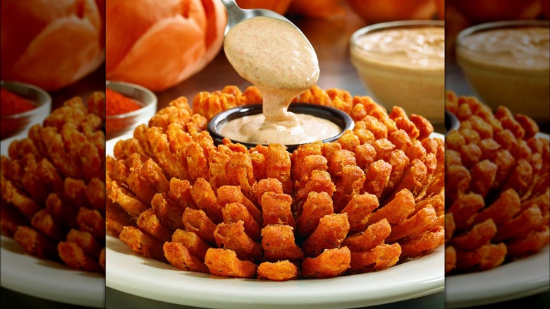For some, Outback Steakhouse's Bloomin' Onion is the stuff of legends. Created back in 1988 by the chain's founder, the "Aussie-Tizer" is made with huge onions that measure 4.25 inches in diameter and weigh 1.24 pounds. Each onion is cut into 200 petals, breaded, and deep-fried until golden brown. One Outback employee described the intricacies of the Bloomin' Onion preparation process for Insider, saying, "We have to take a whole onion, cover it [in] flour, submerge it in soda batter, put more flour on it, and finally put it into the deep fryer and hope that it will come out intact." To top off the experience, the Bloomin' Onion comes with the restaurant's special spicy dipping sauce.