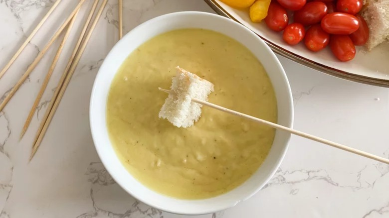 Recipe developer and registered dietician Kristen Carli suggests using this fondue to sneak some vegetables into your diet by adding a few slices of bell pepper, carrots, and celery next to the standard cubes of bread for dipping.