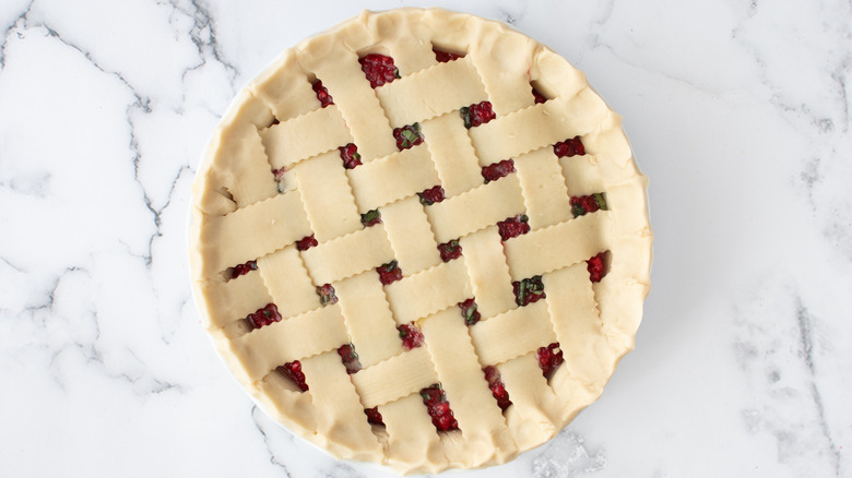 - Weave the remaining strips of pie dough through those original pieces, creating a lattice-like look. Cut off any dangling strips of dough and crimp the lattice-weaved pieces and the bottom crust together.