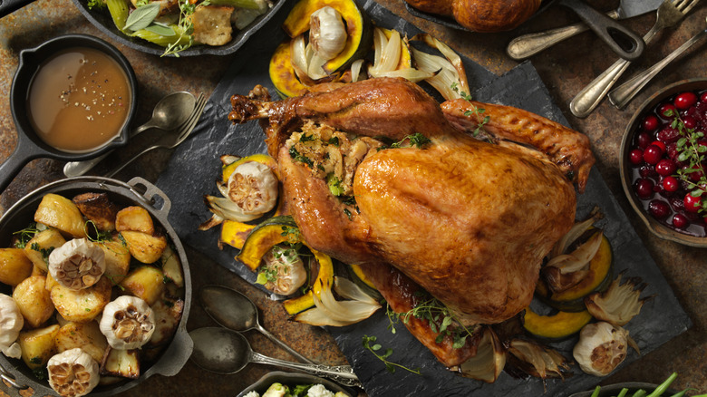 Costco's turkey dinner checks off all of the boxes that a Thanksgiving dinner should. The meal features half of a seasoned turkey breast and its classic accompaniments: Yukon gold mashed potatoes, roasted vegetables, and an herb stuffing. Of course, Thanksgiving wouldn't be complete without poultry gravy and cranberry sauce, both of which also come with the meal. The package claims that the feast can feed seven to eight people, but folks on TikTok seem to disagree. The dinner is priced at $3.99 per pound, and one TikTok creator who gave viewers a tour of the meal, @costcohotfinds, showed the total price to be roughly $36. If this kit does indeed feed eight, that would be a deal worth pursuing this Turkey Day. Unfortunately, this doesn't seem to be the case.