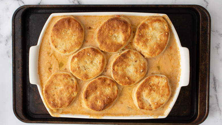 - Top the casserole dish with the biscuits, spacing out evenly.