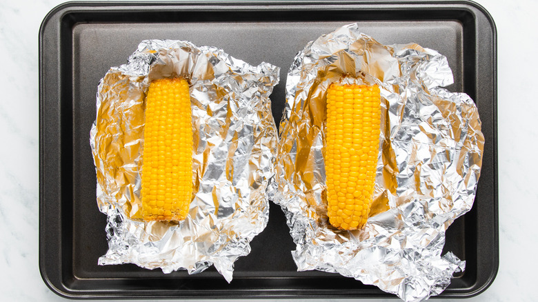 - Place two pieces of aluminum foil on a baking sheet then place one ear of corn onto each piece of foil.