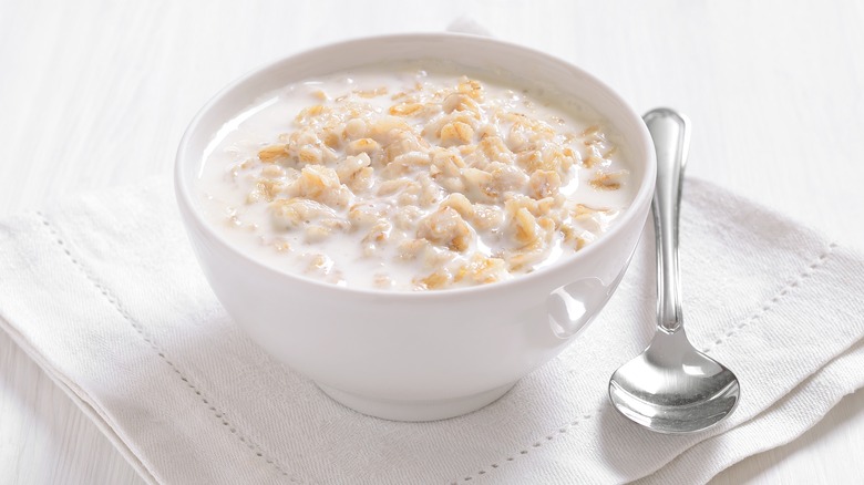 You can add it to both hot oatmeal and cold overnight oats. Go ahead and make your oatmeal as usual, just substituting eggnog for any liquid you would normally use. If you're making overnight oats with yogurt, you might want to go with half yogurt and half nog. For an extra flavor punch, add in a little cinnamon and vanilla, plus any toppings — like a sprinkling of nuts (especially pecans), dried fruits like golden raisins, and butter. Brown sugar or maple syrup would make excellent sweeteners.