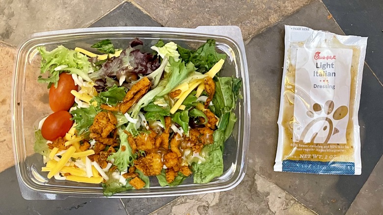Fast food restaurants aren't known for their devotion to healthy eating. Most people don't go to a place like Chick-fil-A for a salad. However, once you get there, you may notice that Chick-fil-A has a surprising number of healthy options, and they boast a diverse array of salads and delicious dressings. While the company offers basic balsamic and Italian dressing options, it also provides a variety of choices such as honey mustard and creamy salsa.