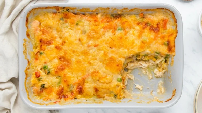 Despite being one of the quintessential comfort foods, chicken casseroles can become repetitive. Many of us have a go-to recipe, whether it's a family favorite that you loved as a child or one that you've honed by yourself based on what's in your freezer or the flavors you gravitate towards. These recipes are reliable, resourceful, and often delicious, but if you have them on heavy rotation, you might be sick of them. Luckily, it doesn't have to be this way. The beauty of casseroles is that they can be whatever you want them to be. As long as they're baked in a casserole dish, they count as casseroles (and there's probably an argument to be made that they aren't even limited to that definition).