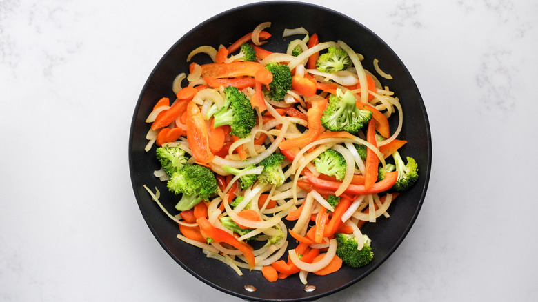 - Add onion, bell pepper, carrot, and broccoli and stir-fry for 4-5 minutes.
