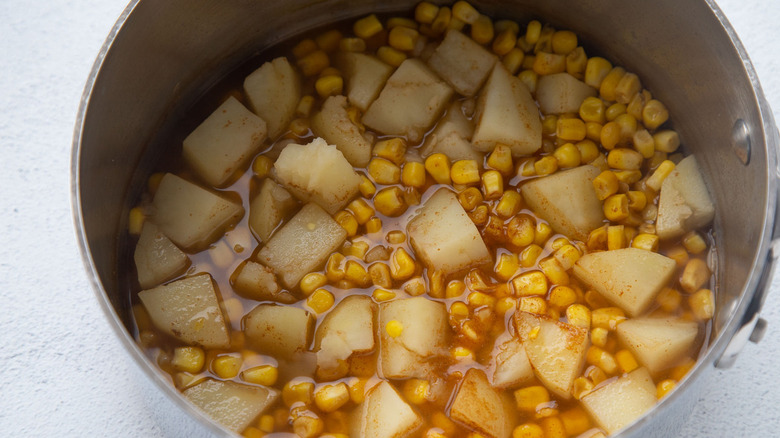 So why isn't Shungu opting to use waxy potatoes in her corn chowder? It's because of what she calls her "special technique" which involves pureeing a portion of the potatoes and corn. This puree, she says, "adds richness to the soup without having to add tons of heavy cream." As russet potatoes puree more smoothly than a waxy variety such as Red Bliss, that's why they make for the best chowder thickener.