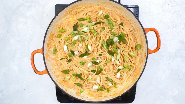 A big perk to including both kimchi and gochujang in this pasta recipe is that there will also be a distinct level of warmth that additions like hot sauce just can't compete with. Subtly spicy, a little bit tangy, and even a bit sour, this is a pasta dish that manages to balance flavor profiles perfectly.