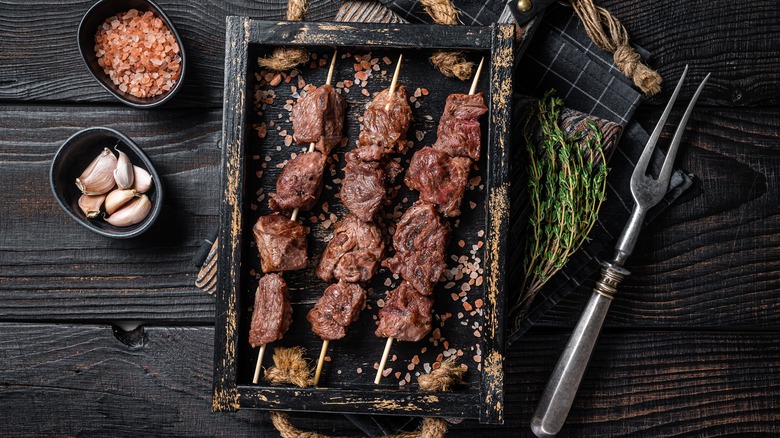For best results, marinate the meat with your desired spices in the fridge for a full 24 hours, using a ratio of half a cup of marinade for every pound of meat you plan to skewer. However, if you didn't plan that far ahead, you can still get away with just marinating it for 3 hours. You'll only need to grill the kebabs for six to 14 minutes total, depending on how done you want them. If you plan to cook the meat until it's well done, grilling veggies on the same skewer can cause you to burn your veggies.