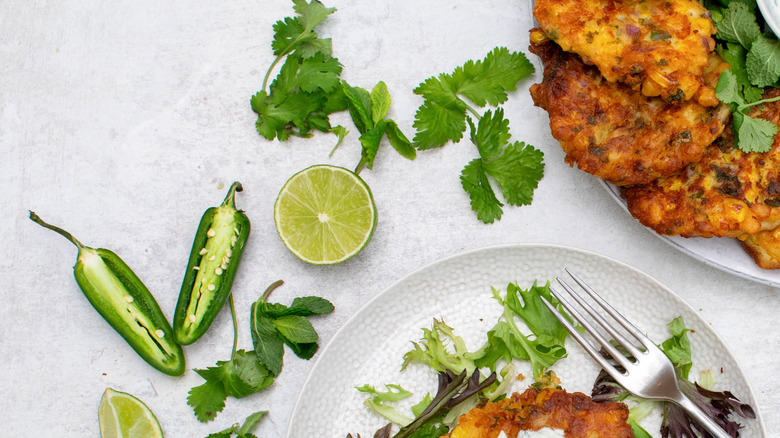 - Serve the fritters warm with the yogurt dip and lime wedges, cilantro, and mint, if using.