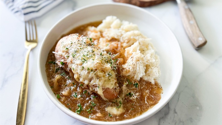 The blandness of chicken breast meat ensures that the iconic mixture of sherry, caramelized onions, and beef stock is left unaltered while broiling the chicken with grated Gruyère pays homage to the usual cheesy top that comes with the soup.