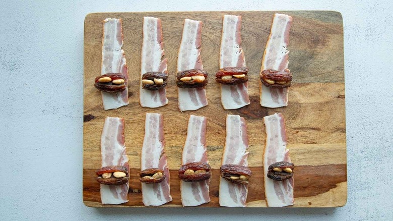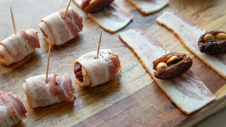 Devils on horseback, an hors d'oeuvre that dates back to the Victorian era, are traditionally made with prunes that have been soaked in tea and then wrapped in bacon. Some contemporary updates, however, opt to include dates in place of the traditional prunes for a different flavor. As evinced by this recipe for sweet and salty devils on horseback, recipe developer Kate Shungu is a fan of dates wrapped in bacon, and in her experience, she finds that they "are often the first items to disappear off a buffet at a party; I love serving these because they are so popular."