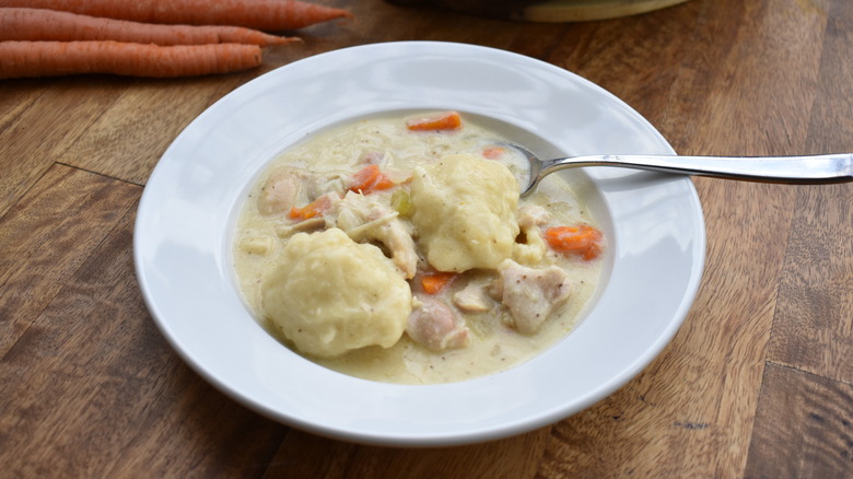 To prep the chicken thighs, blot them dry with a paper towel, and season them with salt. Pop them into heated cooking oil in a Dutch oven, and allow the meat to get a nice brown color on both sides, then put your seared thighs on a plate to the side. The chicken will then be returned to the pot once the broth base is ready and simmered until it is cooked through and tender. Rapone recommends removing the chicken for a final time to cube it into bite-sized pieces, then adding it back in, along with the sumptuous dumplings, to complete the dish.