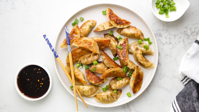 Topalu leaves the choice of dipping sauce up to personal preference, but she offers some advice if you haven't yet found your go-to. "Common dipping sauces for vegetable potstickers include soy sauce mixed with rice vinegar, sesame oil, hoisin sauce, or a combination of these." She also suggests adding textured ingredients to the dip to infuse it with flavor, such as sesame seeds, ginger, garlic, or green onions.