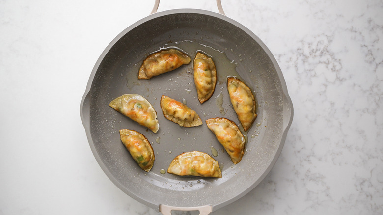 The worst outcome when making crispy vegetable potstickers would be if they didn't turn out crispy. And while the combination of steaming and pan-frying typically offers consistent results, a few factors can help increase your chances of success. For starters, the last thing you want is for the dumpling wrappers to stick to the pan and tear, letting the contents spill out. To avoid this issue, Topalu recommends using a nonstick pan and the full amount of oil specified in the recipe.
