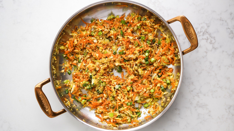 - Add cabbage and carrots and continue to cook for 4-5 minutes, until vegetables are softened.