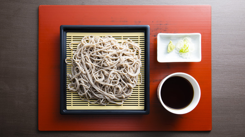 But let's delve further into nutritional value. According to Healthline, every 2 ounces of 100% buckwheat soba noodles contain 8 grams of protein and 3 grams of fiber. It also contains a range of vitamins and minerals, including thiamine, niacin, iron, magnesium, and manganese. The nutritional value of soba noodles is roughly on par with whole-wheat spaghetti. So if you're looking to include more whole grains and seeds in your diet, eating more soba noodles is an easy — and delicious — way to do so.