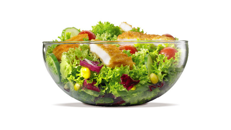 How is a salad on the same calorie wavelength as a Whopper? During a 2020 interview with Mashed, registered dietitian Sue Heikkinen stated that, while a Whopper clocked in at 675 calories, the Crispy Chicken Garden Salad came in at a staggering estimated 870 calories and 71 grams of fat. Yes, the salad has a base of lettuce, but it's the crispy part of the garden salad — that is, the battered and fried chicken on top — that adds to the calories. If a person also uses dressing, then the salad will become even more calorie-dense. Needless to say, calling something a salad does not necessarily mean it is a healthy option, so it's best to think about the ingredients that go into a Burger King salad before you order.