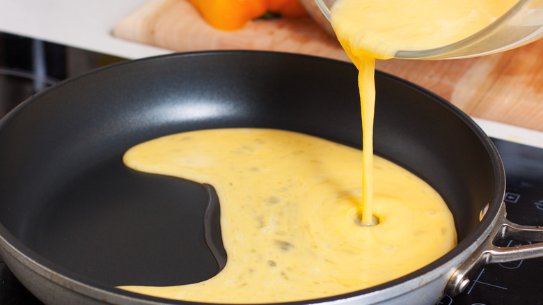 Folded eggs come together so quickly that you'll want to get all the components of the meal together before whisking the eggs. Once you have your toast, salad, bacon, or whatever you're serving them with prepped and plated, it's time to get the pan heated and the eggs mixed. The basic recipe calls for butter (for the skillet), eggs, cream, and salt. Since the texture is of utmost importance, it's best to leave out bulky or dense ingredients like veggies, but there are ingredients you can add if you want to mix things up a bit.