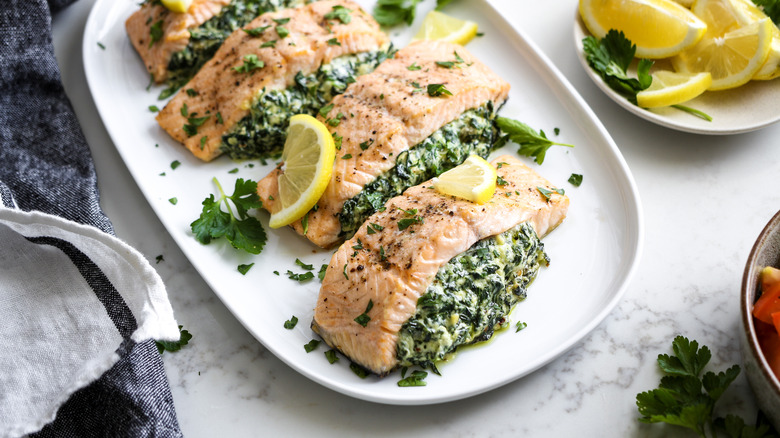 Salmon is such a versatile seafood option, so it's no surprise that it regularly ends up on menus. Whether you're looking for a weeknight dinner or a dish for hosting, it can be prepared in countless ways to suit your tastes. Mashed recipe developer Feta Topalu shares this cheesy spinach-stuffed salmon recipe that is anything but boring. This delicious dish is stunning on the plate and an absolute delight for your taste buds. Each salmon fillet comes loaded with a spinach and cream cheese mixture, making it the ultimate deluxe version of a salmon dinner.