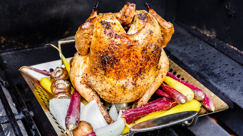 If you're looking for a non-alcoholic substitute for the beer in beer can chicken, just about any kind of soda will do. Still, there's really no need to sacrifice a soda, beer, or any other kind of beverage since, as we've already mentioned, very little (in fact, probably none) of the beer actually penetrates the chicken. This means that in all actuality, beer doesn't add much flavor to the chicken at all. You can actually just fill up an empty aluminum can with plain tap water and achieve a very similar result. An even better bet might be to invest about 10 to 15 bucks in a vertical chicken holder as these provide better airflow than liquid-filled cans and make it easier for the chicken to reach a safe internal temperature (165 degrees Fahrenheit, as per the USDA).