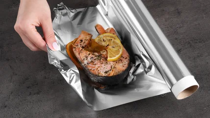 You might know what we're getting at if you're proficient in chemistry. However, if you haven't thought about the subject since high school, here's the reason these two common kitchen-finds don't mix: As you likely know, aluminum is a type of metal, and lemons are acidic. When the two interact, it creates a reaction. In the case of cooking with lemon on aluminum, the citric acid in the fruit is strong enough to cause the foil to break down into small particles that will leach into your food, giving it an off-putting gray color and a metallic taste.