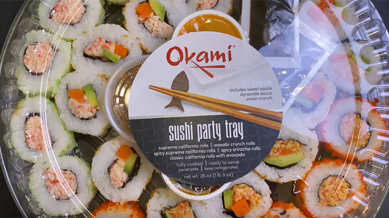 The Okami sushi platter is not as big as the other options on this list, but thanks to some unhappy Costco-goers on Reddit, we thought it deserved a mention. This 1 lb 9 oz party platter consists of a variety of 25 sushi pieces, and it's priced at $8.99. The tray includes California rolls, wasabi crunch rolls, spicy supreme California rolls, spicy Sriracha rolls, and classic California rolls with avocado. Wasabi, ginger, sweet sauce, a dynamite sauce, and bits of onion crunch also accompany the rolls.