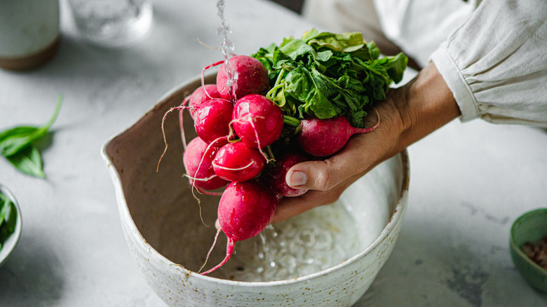 If you suddenly find yourself with an abundance of radishes or don't plan to use them anytime soon, freezing them is an option for longer-term storage. Radish-freezing is slightly more involved. It requires you to first clean and destem your veggies. Then, cut them into cubes or halves, and blanch them by boiling quickly (for two to three minutes max) before transferring your produce into ice water and drying them off. Finally, you're ready to place them into freezer bags (removing excess air) and store them in the freezer, where they can chill for at least six months or even a year. However, they won't quite maintain their taste or texture.