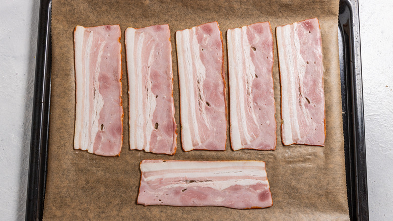 - Arrange the bacon slices on a parchment-lined baking tray.