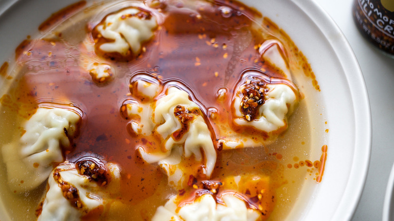 A three-ingredient recipe that's worth eating for dinner several times a week sounds too good to be true, but developer Feta Topalu really does dine upon this super-simple, slightly spicy soup on a regular basis. She says of the dish, "It really hit[s] the spot." Not only is it flavorful and filling, but it only takes only about 10 minutes from start to finish — all you need to do is to heat up frozen wontons in chicken broth, then stir in a few spoonfuls of chili crisp. If you have a few more moments, though, you could dress it up with a few garnishes or condiments, or maybe add some extra protein.