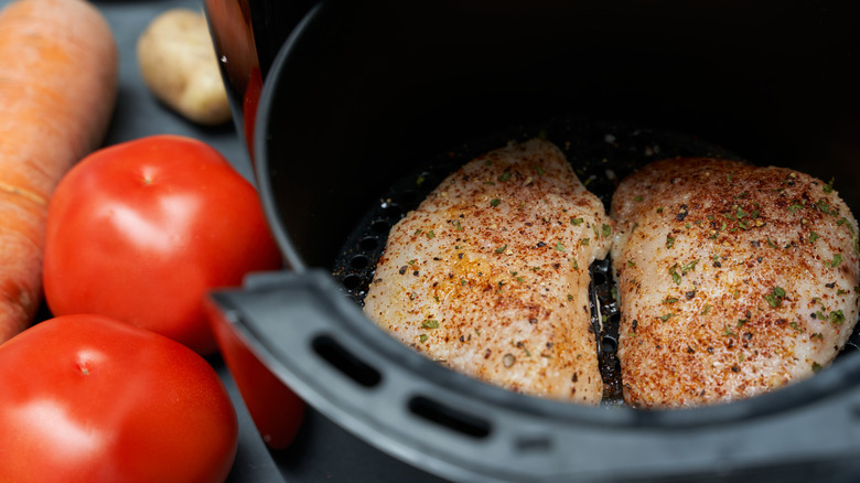 There's so much you can do with an air fryer, sometimes the hardest part is simply deciding what to cook next! To figure out the best meat to cook in an air fryer, Mashed compared tests from places like America's Test Kitchen and Cooking Light, sorted through chef recommendations, and even tackled practicalities like ease of use (not easy trying to fit a whole roast into an air fryer) and potential messes (looking at you bacon, with your grease-splattering tendencies). After all the grease settled, the crown for the best meat to cook in the air fryer went to a good ol' weeknight classic: chicken breasts.