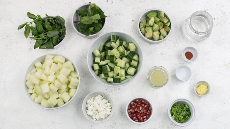 Gather the ingredients for chilled cucumber melon soup