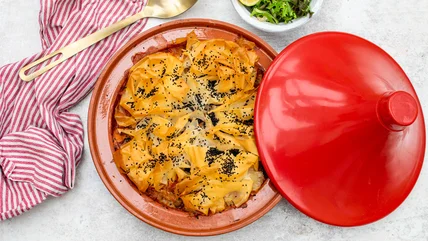 This sweet potato tagine pot pie is first cooked on a stove until the sweet potatoes are just soft, then transferred to an ovenproof dish, topped with scrunched-up phyllo pastry, and baked until the topping is golden crisp. Randles likes to serve this show-stopping dish in the base of a traditional tagine pot but if you don't have one, you can also use a 10-inch round ovenproof dish or pie dish.